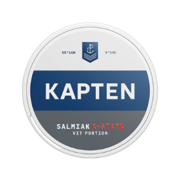 Kapten Salmiak X-stark är ett extra starkt white-snus med en tydlig salmiaksmak i en fylligare större prilla.